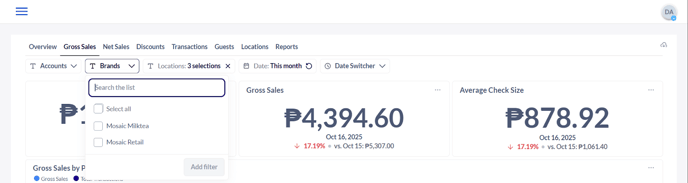 - The Brand Filter lets you select the Brand Name that is associated with the registered account name.