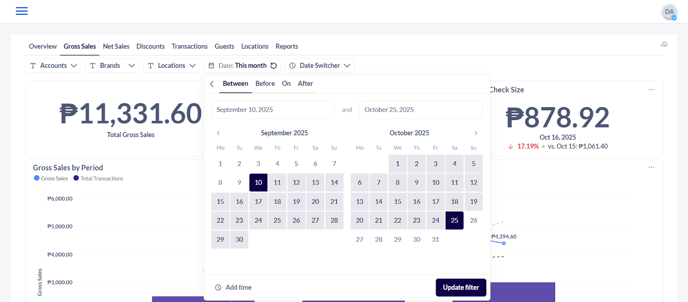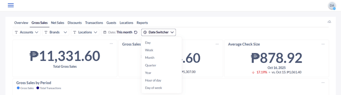 - Gross Sales by Period - the total, raw monetary value of all sales transactions before deduction of any fees, services, discounts, etc.