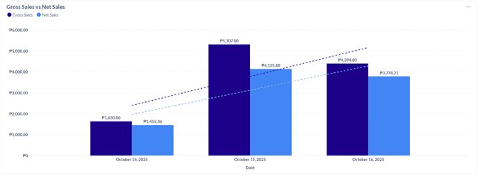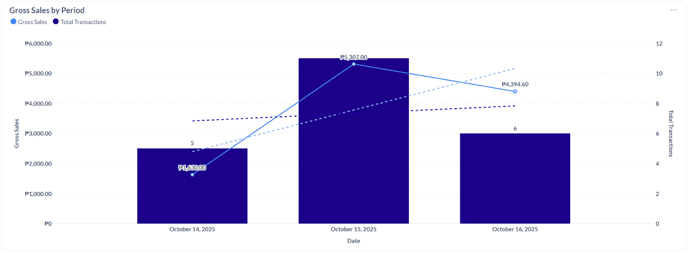 - The light blue line and the dots on it (Gross Sales) show the total money earned—that's how much cash was collected from all the transactions created.