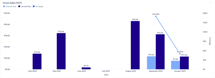 - Gross Sales Year on Year (YoY) - compares total sales from one year to the same period in the previous year. It shows how much sales have increased or decreased annually, helping measure business growth or decline.