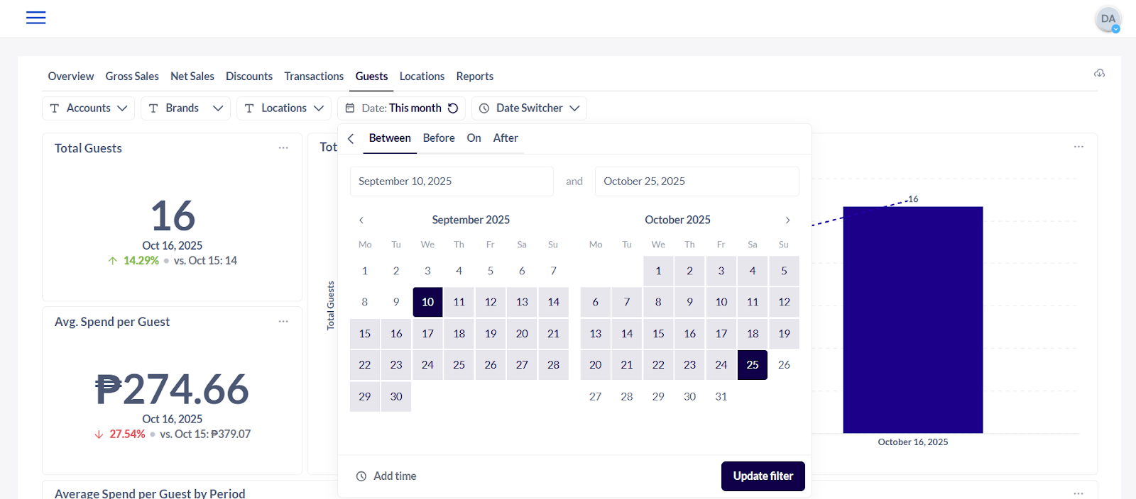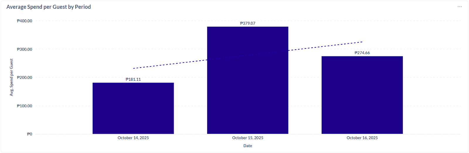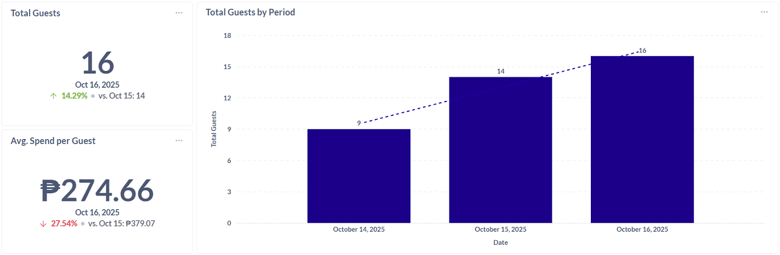 12. Average Spend per Guest by Period - The average amount each customer spends during a specific time frame (day, week, month, etc.) that helps track spending trends over time and evaluate the effectiveness of promotions or menu pricing.