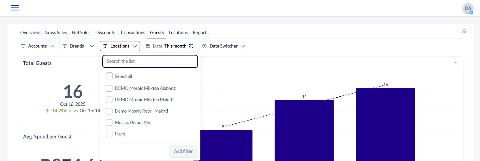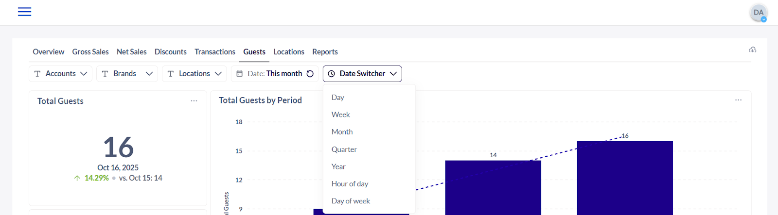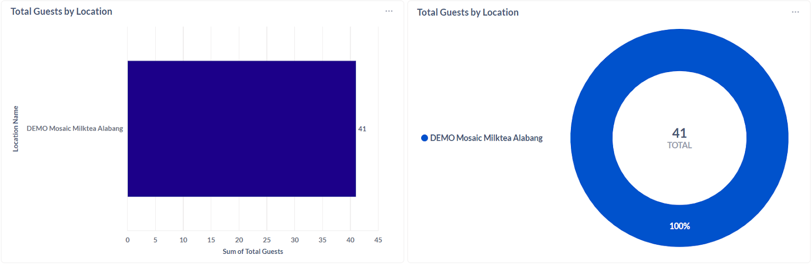 13. Total Guests by Location - The number of individual customers served at each store location during a specific period identifying high-traffic locations, comparing performance across branches, and guide staffing or inventory decisions.