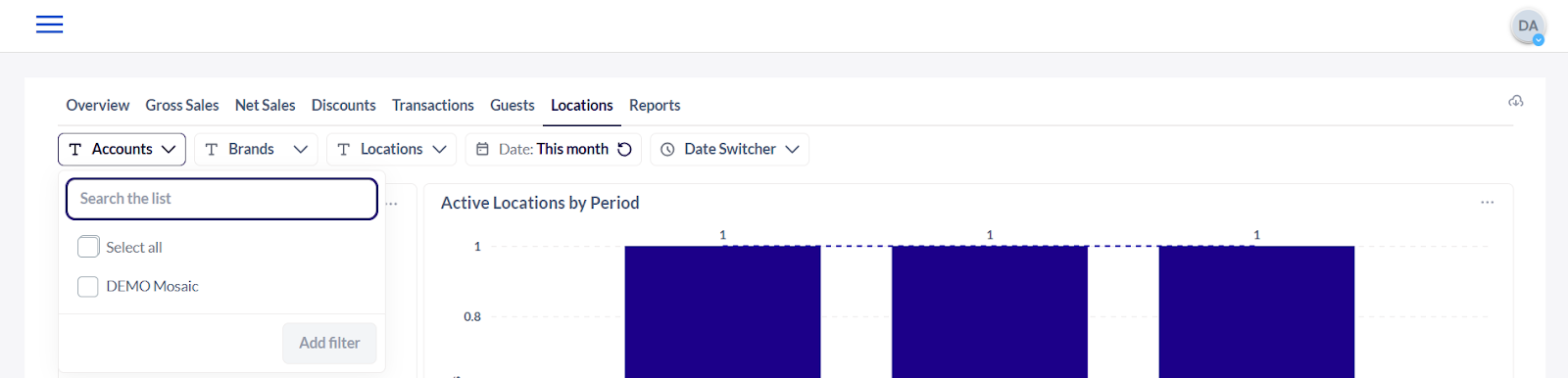 - The Account Filter lets you select the Account Name that is registered with Mosaic.