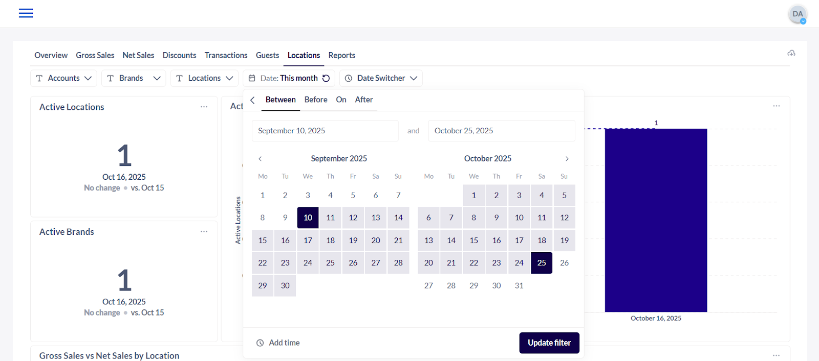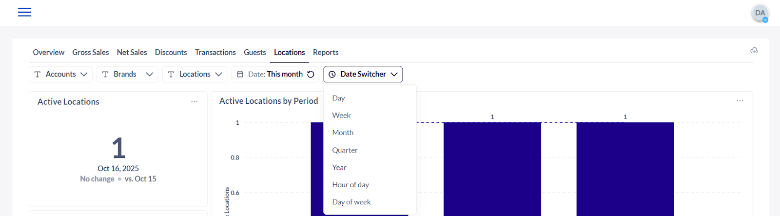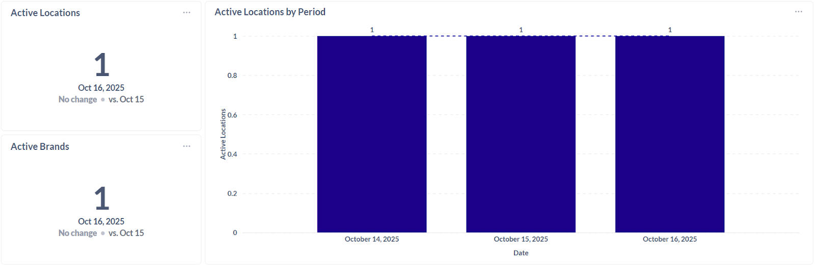 11. Active Locations by Period - The count of locations that were operational and recorded transactions within a specific time frame (day, week, month, etc.), showing activity trends over time.