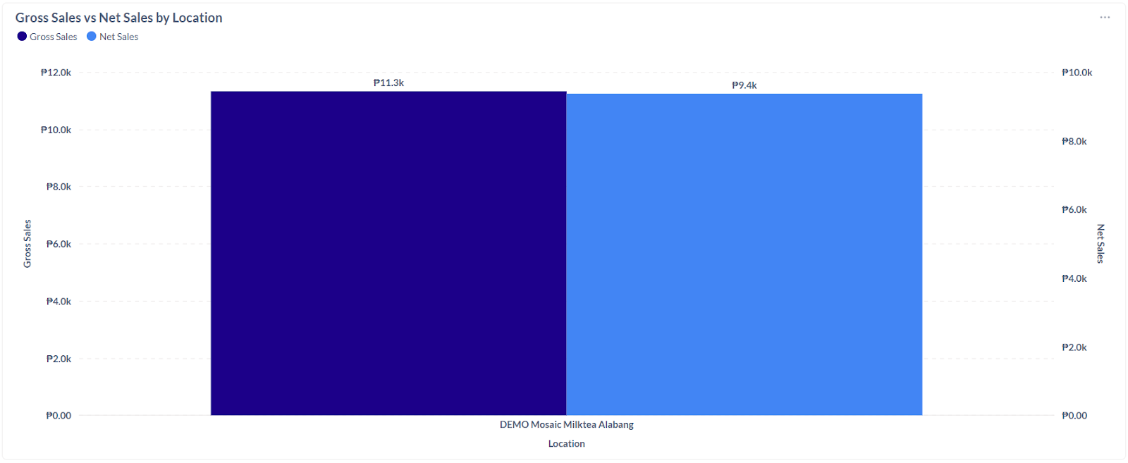 12. Gross Sales vs Net Sales by Location - Compares total sales before deductions (gross sales) with sales after deductions like discounts, returns, or allowances (net sales) for each restaurant or store location.