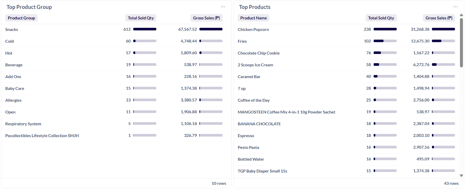 - Top Products - The individual menu items that generated the highest total gross sales highlighting your top menu items or bestsellers.