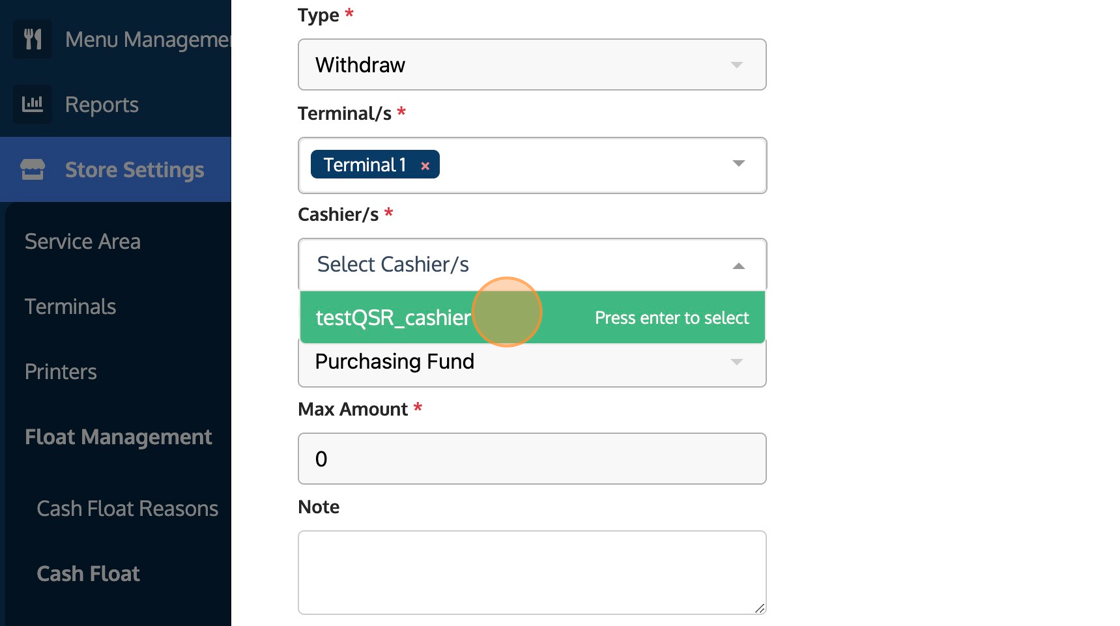 8. Select which terminal you'd like to assign this Cash Float transaction. If you only have one POS terminal, just select the first option "Terminal 1".