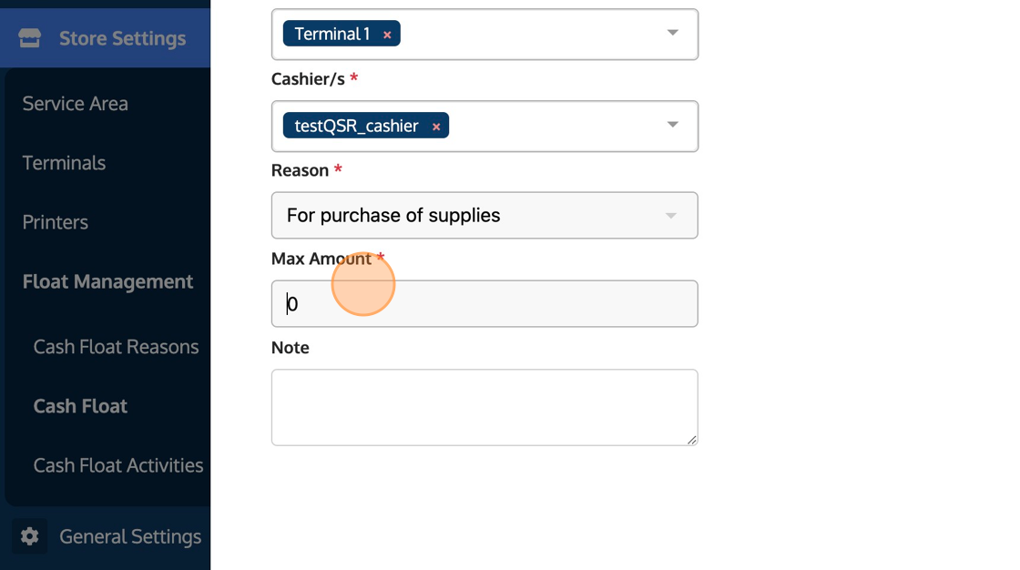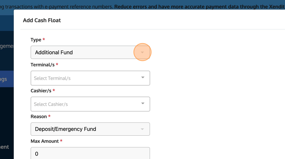 Piliin aling terminal ang gagamitin para sa Cash Float transaction. Kung isa lang ang ginagamit na POS terminal, piliin lamang ang "Terminal 1".