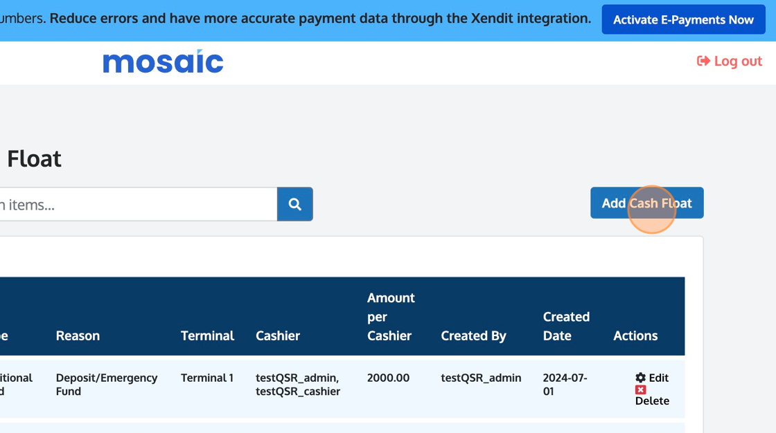 This guide provides step-by-step instructions on how to remotely add cash float to a point of sale (POS) system through the Mosaic POS Back Office. It covers different types of funds, assigning the transaction to a specific terminal and cashier, sele
