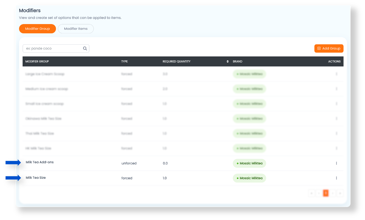 To further understand, similar to Mosaic POS, modifier items a.k.a. "modifiers" are grouped under "Modifier Groups". This organizes the menu and its items to quickly apply modifier groups to similar items.